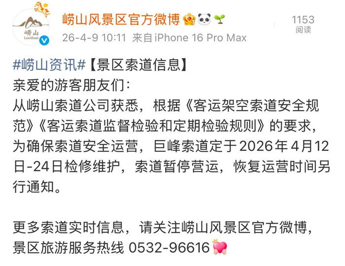 从崂山索道公司获悉,根据《客运架空索道安全规范》《客运索道监督检验和定期检验规则》的要求,为确保索道安全运营,巨峰索道定于2026年4月12日-24日检修维护,索道暂停营运,恢复运营时间另行通知。
