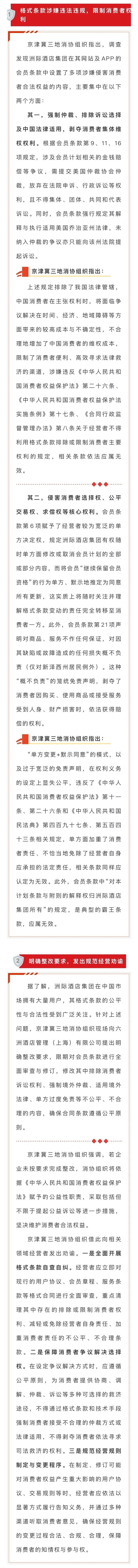 针对国际酒店集团“洲际酒店”在其会员计划《洲际优悦会会员条款与附则》(以下简称“会员条款”)中,设置排除中国法律管辖、强制中国消费者赴境外仲裁、限制消费者集体维权权利、可随意变更合同条款、对使用商品造成的损失概不负责等多项涉嫌侵害消费者合法权益的条款,4月8日,京津冀三地消协组织依据《中华人民共和国消费者权益保护法实施条例》第四十条“消费者协会可以就消费者投诉的损害消费者合法权益的行为开展调查,与有关经营者核实情况,约请有关经营者到场陈述事实意见、提供证据资料等”规定,按照中国消费者协会《消协组织消费维权约谈经营者办法(试行)》,对洲际酒店集团国内运营方——六洲酒店管理(上海)有限公司进行联合约谈,并提出明确整改要求。