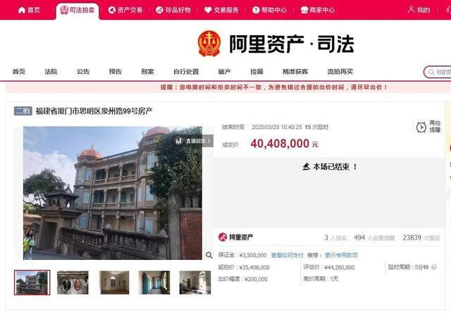 而位于5A级景区厦门市鼓浪屿风景名胜区内的近代建筑黄赐敏别墅(又名金瓜楼),在被厦门市同安区人民法院多次“上架”后,最终于今年3月成功拍出。该别墅建于122年,因其楼顶两个橙黄泛金的拜占廷式穹窿顶而凸显于四周其它众多老别墅,并以此得名,成为游客到鼓浪屿首选的“打卡地”之一。黄赐敏别墅共三层,建筑面积约882平方米,首次拍卖时的评估价高达1.12亿余元,最终以4040万元的价格成交。
