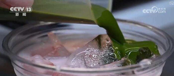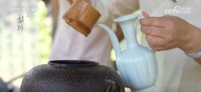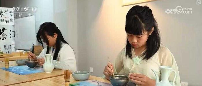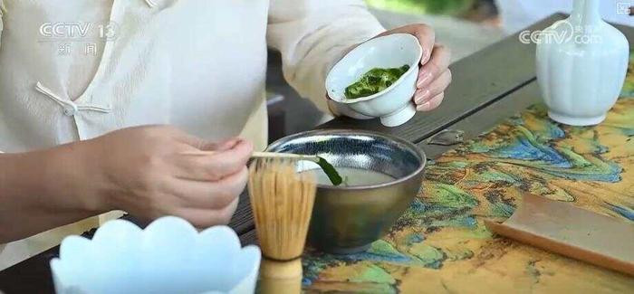 在抹茶生产的过程中,食品安全至关重要。记者穿上防护服,佩戴好手套和口罩以后才得以进入磨粉车间。这是一条抹茶的生产线,被打碎的碾茶就经过上方投放到球磨机以后,被打磨出了非常细腻的抹茶粉,随后通过管道运送到下一个生产环节。来自全省的所有碾茶都会汇聚到这家工厂,每天有超10吨的精制抹茶在这里被生产出来,作为“中国新特产”发往全球的50多个国家和地区。和抹茶一起出海的,还有中华民族上千年的茶文化。一“抹”越千年:宋式点茶“点”活千年古韵