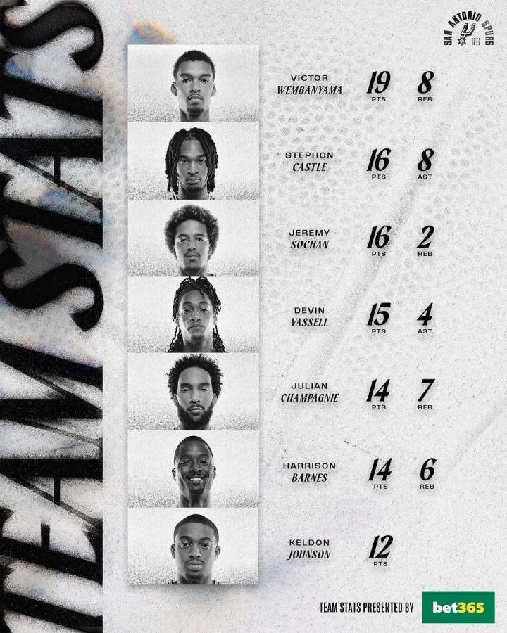马刺ins报道。昨晚的比赛中,圣安东尼奥马刺队有7名球员得分上双!