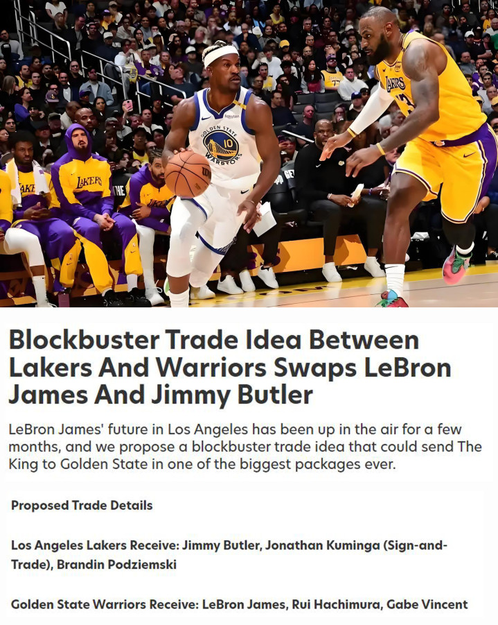 基于此,美媒《Fadeaway World》建议湖人、勇士做一笔交易。具体为湖人送出詹姆斯、八村塁、文森特得到巴特勒、库明加(先签后换)和波杰姆斯基。