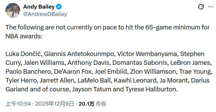 对此,名记Andy Bailey晒出了一众按照目前的缺阵节奏可能无缘65场评奖标注的球星们,具体如下: